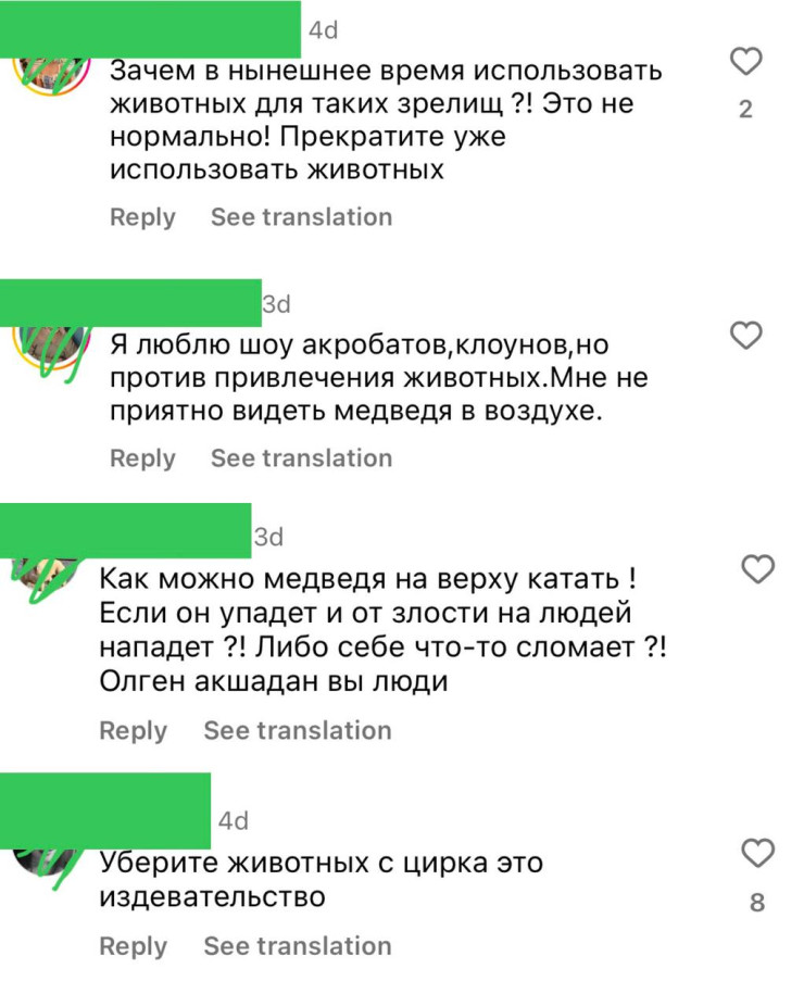 Корреспондент обратилась за комментарием к представителям цирка. По словам заслуженных артистов России, дрессировщиков медведей Василия Порхуна и Долорес Запашной, медведя зовут Машка, ей 23 года и она давно участвует в цирковых представлениях. В своем ответе они отметили, что для Машки это не стресс, а часть ее обычной активности, сравнив ее полеты над сценой с лазанием медведей по деревьям в дикой природе.