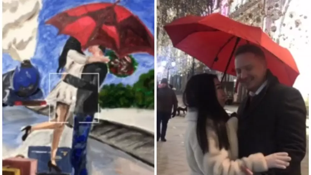 "В январе 2022 года лечу к подруге через Москву и знакомлюсь там с будущим мужем, который встречает меня с красным зонтом", - говорится также в ролике.