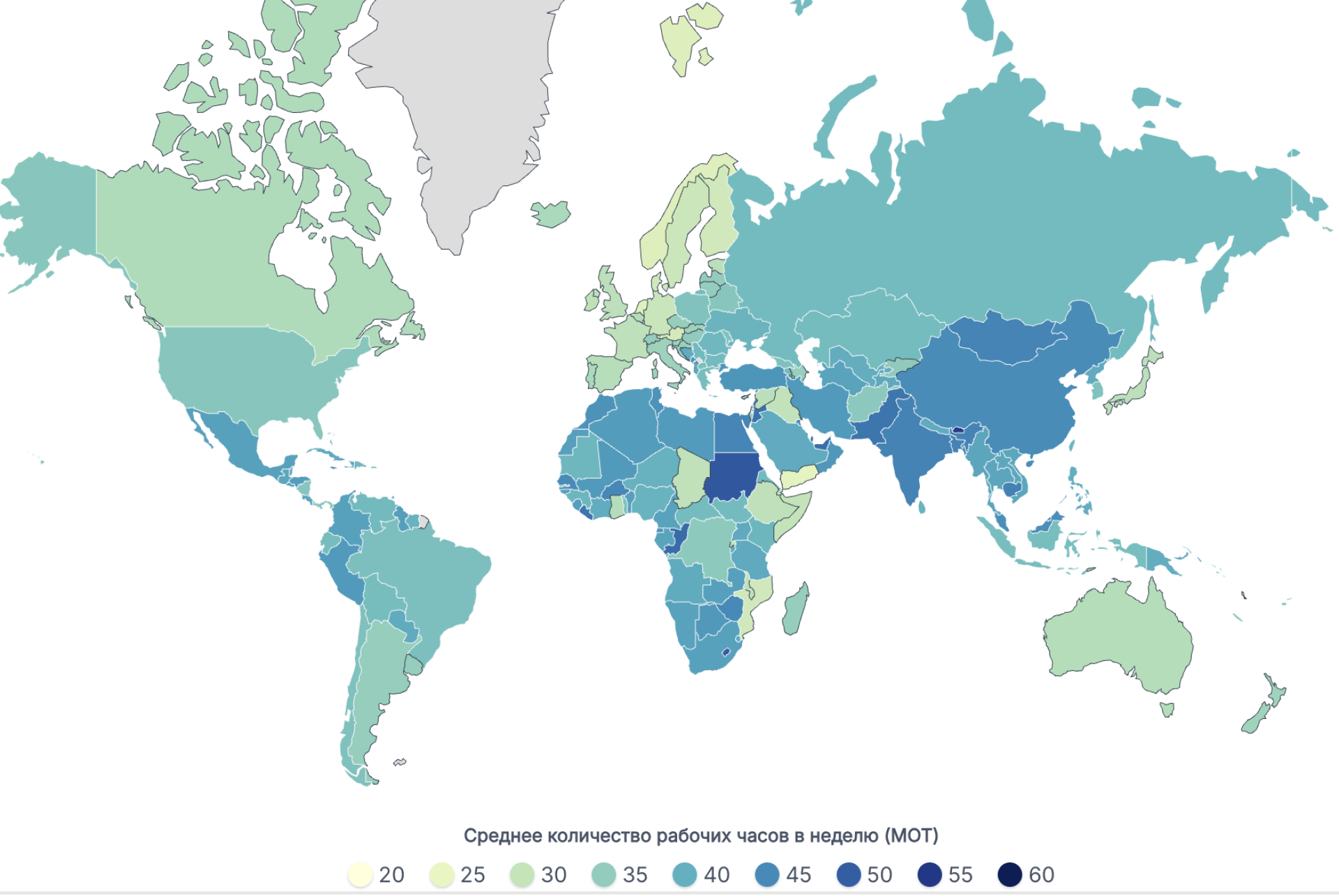 В России средняя продолжительность рабочей недели составляет 38,21 часа. Мужчины там работают 39,21 часа, женщины — 37,16 часа. В Кыргызстане в среднем работают 35,19 часа: 38,74 часа у мужчин и 30,18 часа у женщин. В Узбекистане средний показатель достигает 40,35 часа (43,09 часа у мужчин и 35,19 часа у женщин).