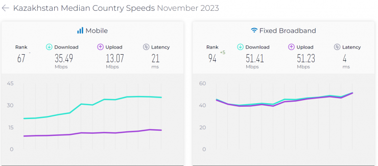 По скорости мобильного интернета Казахстан занял 67-е место со средним показателем в 35,49 Мбит/с, однако по скорости стационарного интернета страна находится на 94-м месте с 51,41 Мбит/с.
