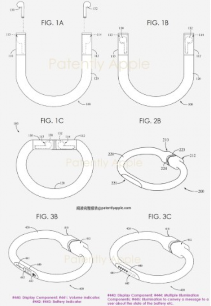 В первом патенте описываются традиционные беспроводные наушники AirPods, но в качестве зарядного кейса для них используется браслет. Он разъединяется, и с каждой стороны вставляется по наушнику. На этом браслете даже может быть небольшой дисплей, отображающий уровень заряда, громкость и уведомления. Не исключено, что такой гаджет способен служить в роли фитнес-трекера.