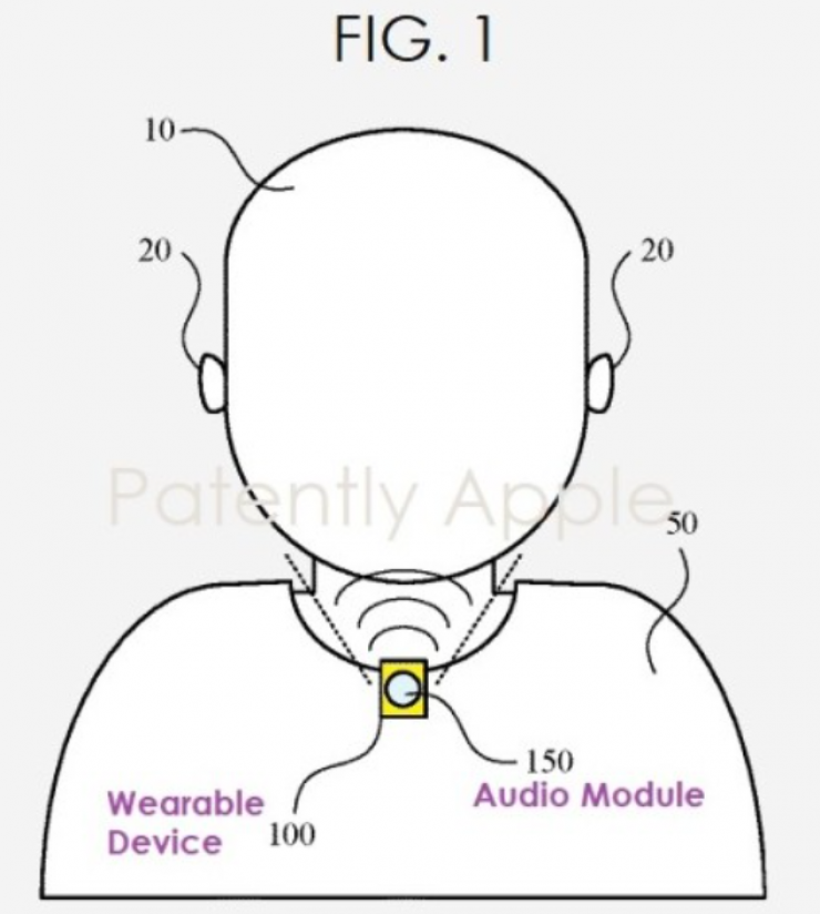 Второй запатентованный гаджет представляет собой устройство, находящееся на шее владельца, например, закреплённое на одежде. Предусматривается, что оно содержит специальный массив динамиков, способный направлять звук непосредственно в уши пользователя, ограничивая его для всех остальных вокруг. Таким образом, уши человека всегда будут свободны, что позволит ему беспрепятственно слышать всё вокруг.