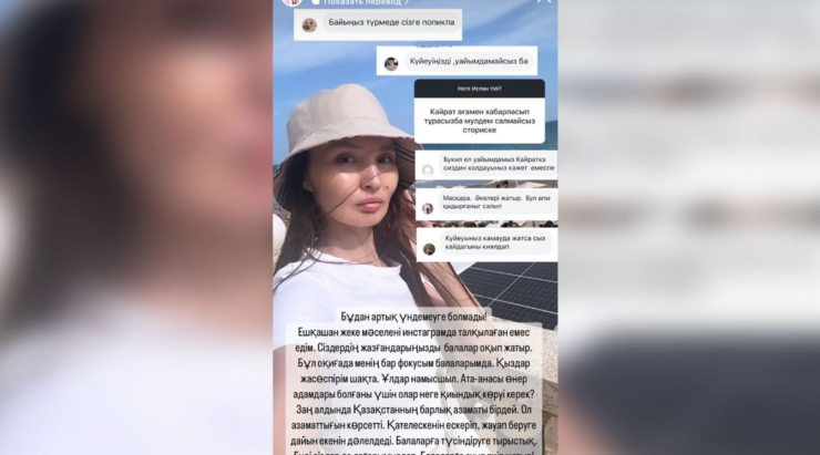 Супруга Кайрата Нуртаса сейчас находится вместе с сыновьями в Испании. Ранее она отмечала, что планировала эту поездку с детьми за полгода, поэтому арест мужа не изменил их планы на каникулы. Впервые знаменитость прокомментировала инцидент с Кайратом Нуртасом и поставила точку в обсуждениях. Подробнее рассказывает Tengri Life.