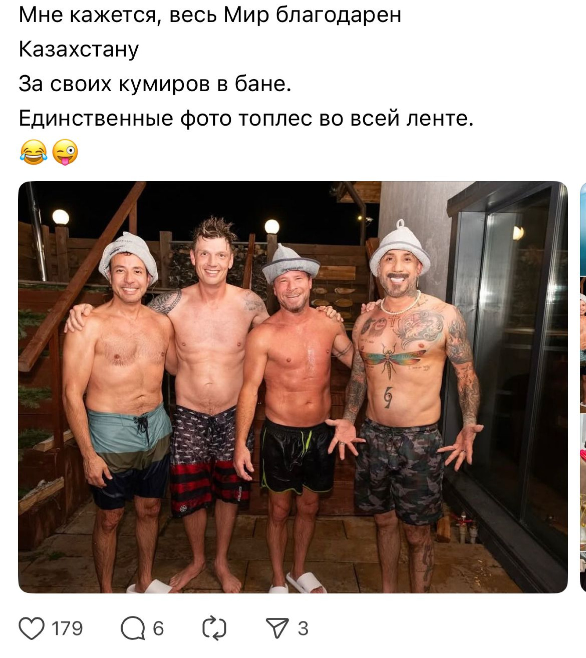 Американская группа Backstreet Boys, которая недавно дала концерты в Алматы и в Астане, поделилась в Instagram серией фотографий из бани. Публикация привлекла внимание пользователей сети, передаёт Tengri Life.