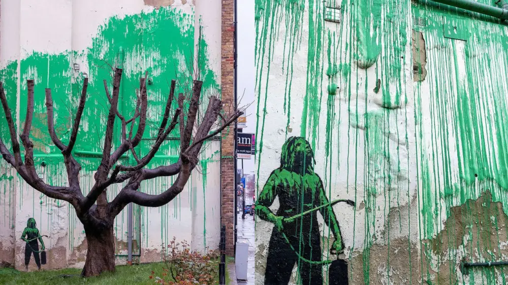 Как сообщает издание Daily Mail, свежие граффити появились на севере Лондона, в районе парка Финсбери. Судя по всему, новая работа художника посвящена проблемам экологии. В композиции участвует реальное сухое дерево с обрубленными ветвями. А граффити на стене позади него имитируют зеленую крону, где вместо листьев подтеки зеленой краски, распыленной некой женщиной.