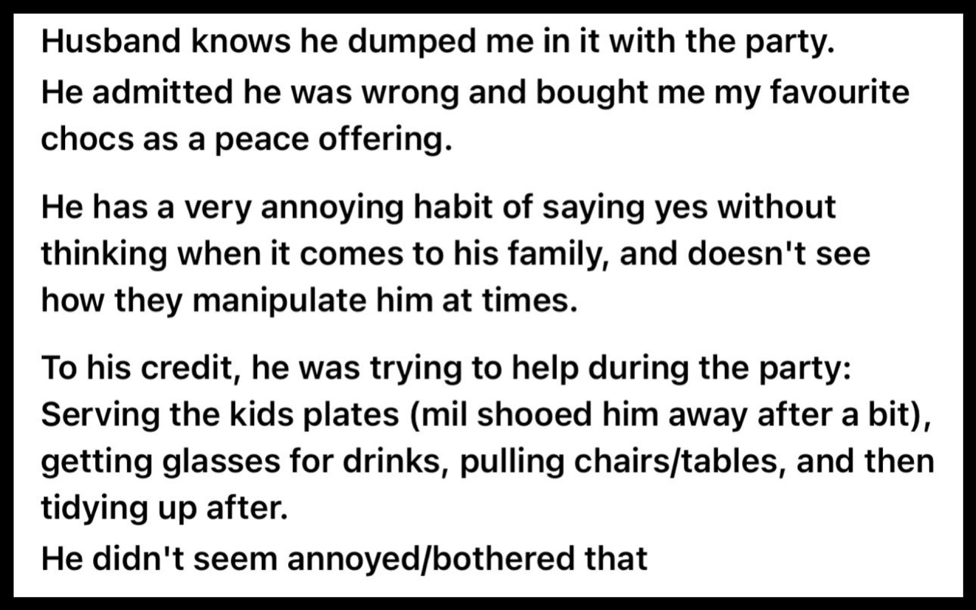 Муж, по словам героини, признал свою ошибку и даже попытался помогать во время вечеринки — сервировал стол и прибирал после гостей.