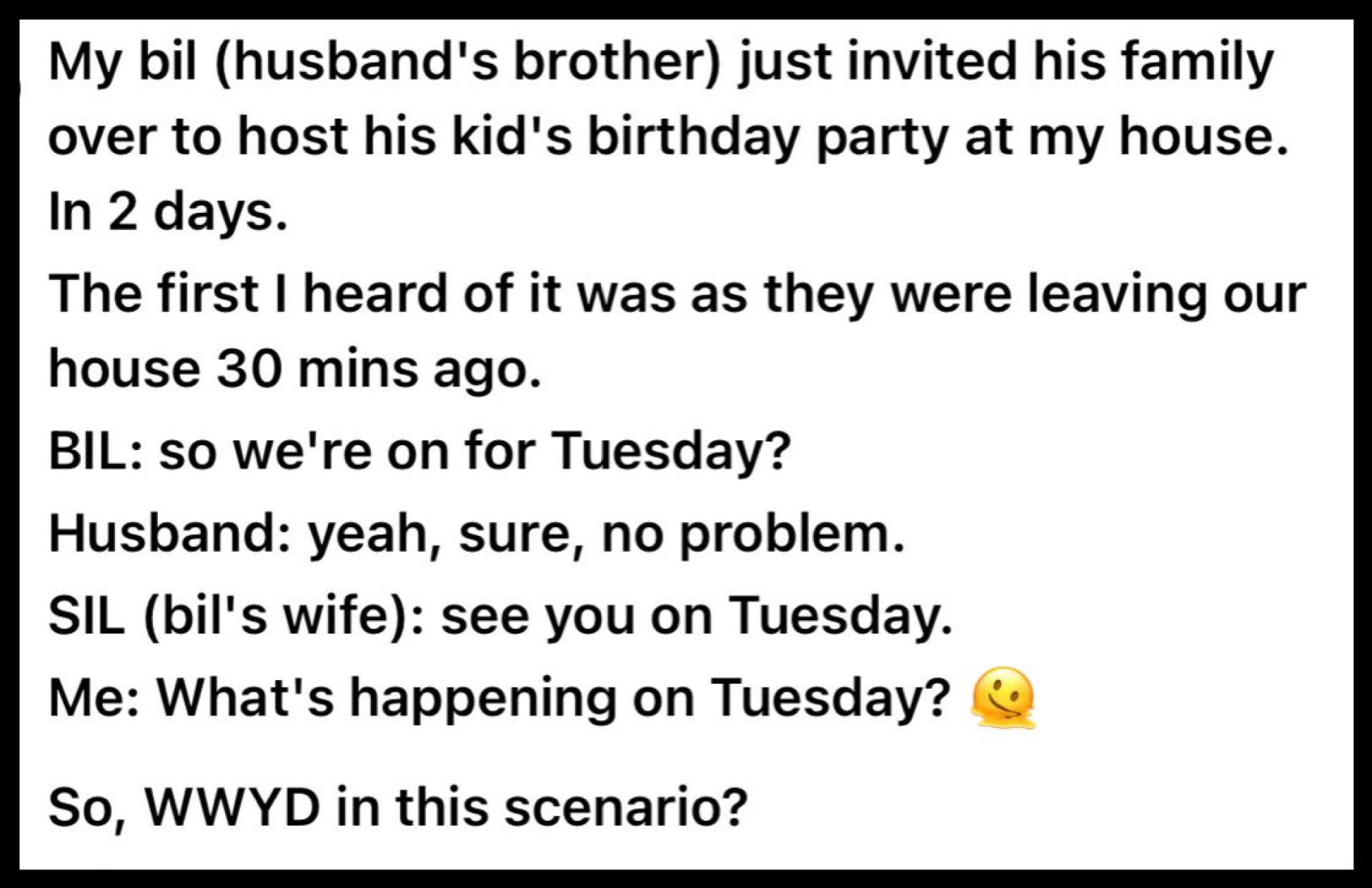 "Мой деверь только что пригласил свою семью провести день рождения его ребенка у нас дома. Через два дня. Первый раз я услышала об этом, когда они уже уходили", — поделилась автор.