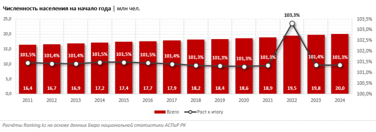 Как сообщает ranking.kz, с начала года в Казахстане проживает 20 миллионов человек, что на 1,3 процента больше, чем в прошлом году. Рост численности населения продолжается со скоростью 1,3-1,5 процента в год, кроме 2022-го, когда из-за "посткарантинного" беби-бума население увеличилось на рекордные 3,3 процента.