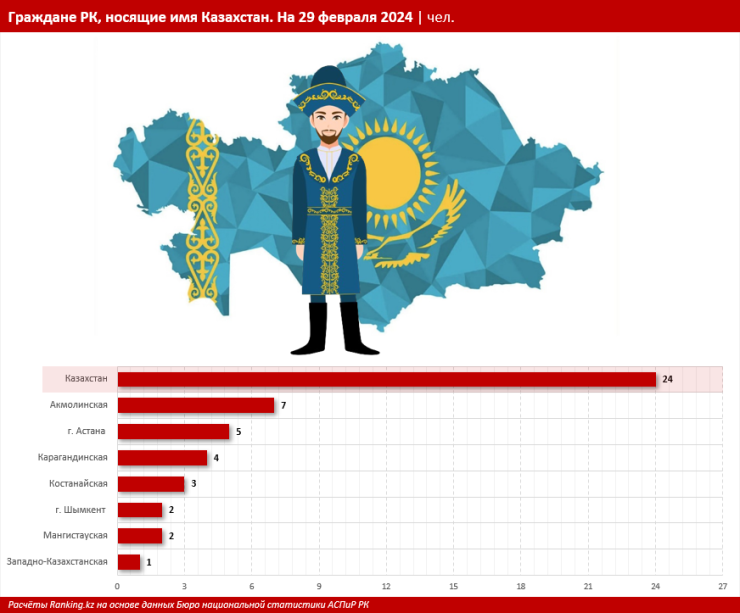 В стране зарегистрировано 24 человека с именем Казахстан. Большая часть из них живет в Акмолинской области: 7 человек. По 5 человек с таким именем есть в Астане и в Карагандинской области. Еще 3 человека по имени Казахстан находятся в Костанайской области, по 2 человека - в Мангистауской области и в Шымкенте, 1 человек - в Западно-Казахстанской области.