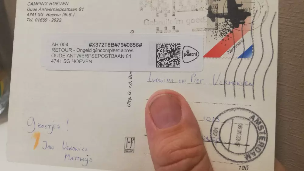 Открытка с простой надписью "Приветствуем", подписанная Вероникой, Яном и Матиасом и адресованная Людвине и Питу Верхувенам в городе Нев-Веннеп, к юго-западу от Амстердама, была отправлена летом 1980 года из города Ховена в южной провинции Брабант.
