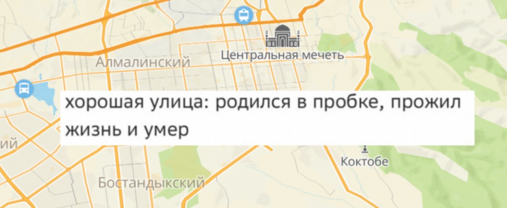Пробки на дорогах города-миллионника давно стали частью жизни алматинцев. Из-за постоянных заторов многие жители приобщились к мопедам, самокатам и метро. Однако есть и те, для кого личное авто остается предпочтительным видом транспорта, даже если приходится стоять в пробках часами. Редакция Tengri Life собрала забавные комментарии с карты 2GIS, которые поднимут настроение в этот пятничный вечер.