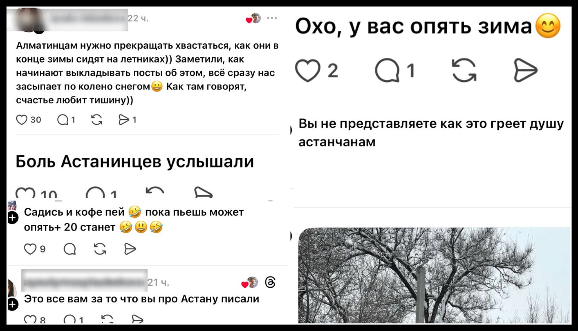 - "Алматинцам нужно перестать хвастаться тем, что в конце зимы сидят на летниках. Замечали, как только начинаете выкладывать посты об этом — нас сразу засыпает снегом по колено. Как там говорят, счастье любит тишину".