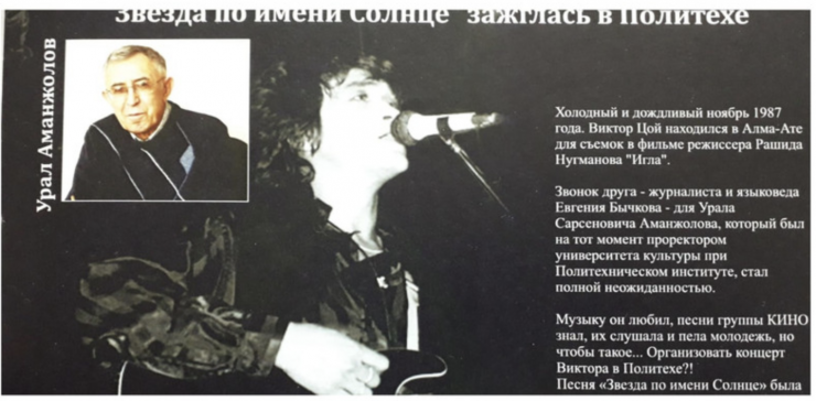 "Слушая песни полузапрещенных тогда рок-групп, я чувствовал: вот то, что мы хотим сказать вслух, но не можем. В один из ноябрьских дней 1987 года позвонил Евгений Бычков и сказал, что в Алма-Ату на съемки фильма "Игла" приезжает Виктор Цой - лидер ленинградской группы "Кино". У Бычкова возникла идея организовать сольный концерт Виктора. Только где его провести? В Казахском политехническом институте, как и в других вузах, функционировали университеты культуры, которые работали по вечерам, туда приглашались известные поэты, писатели, композиторы, искусствоведы, проводились беседы, лекции, просмотры и прослушивания…