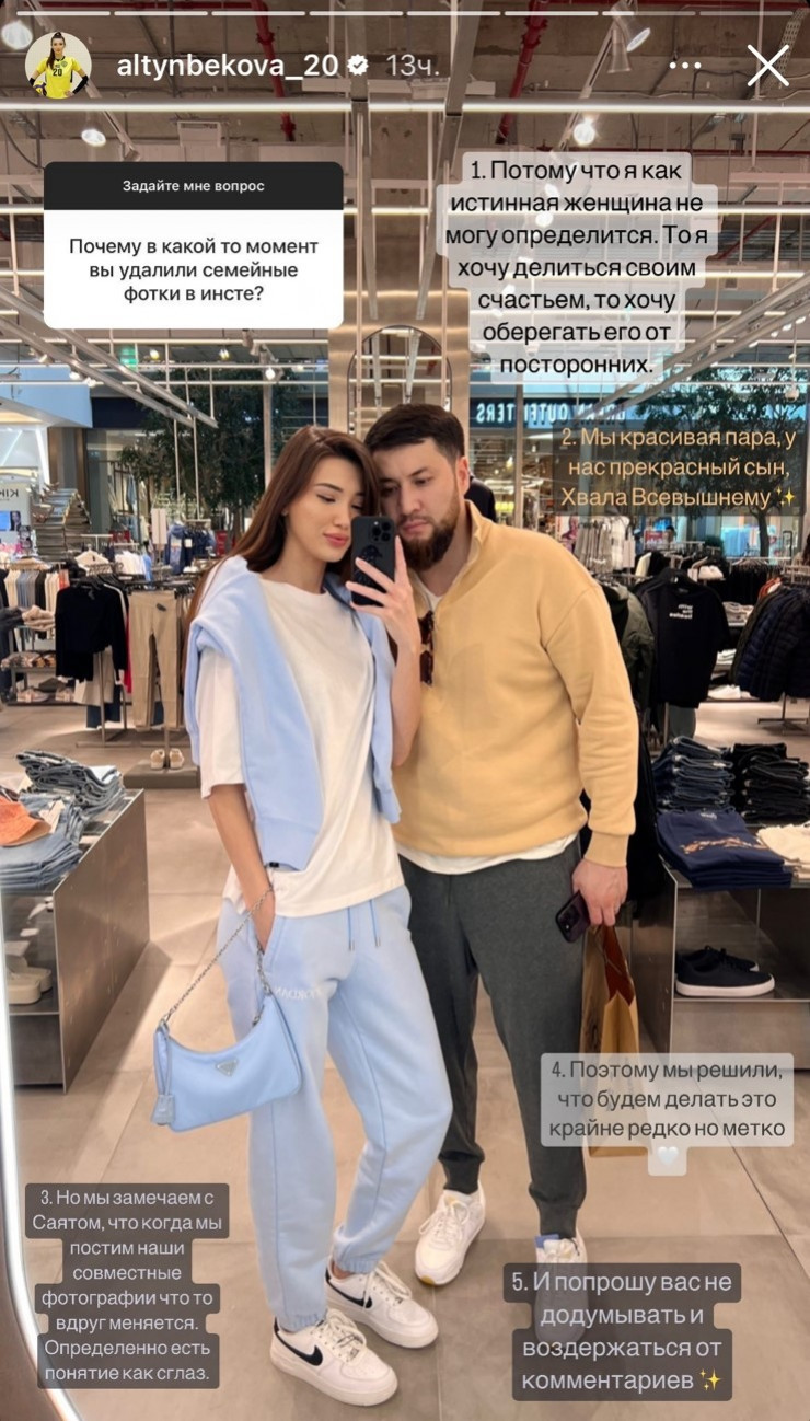"Мы замечаем с Саятом, что когда мы постим наши совместные фотографии, что-то вдруг меняется. Определенно есть такое понятие, как "сглаз". Поэтому мы решили, что будем делать это крайне редко, но метко. И попрошу вас не додумывать и воздержаться от комментариев, - написала Алтынбекова.