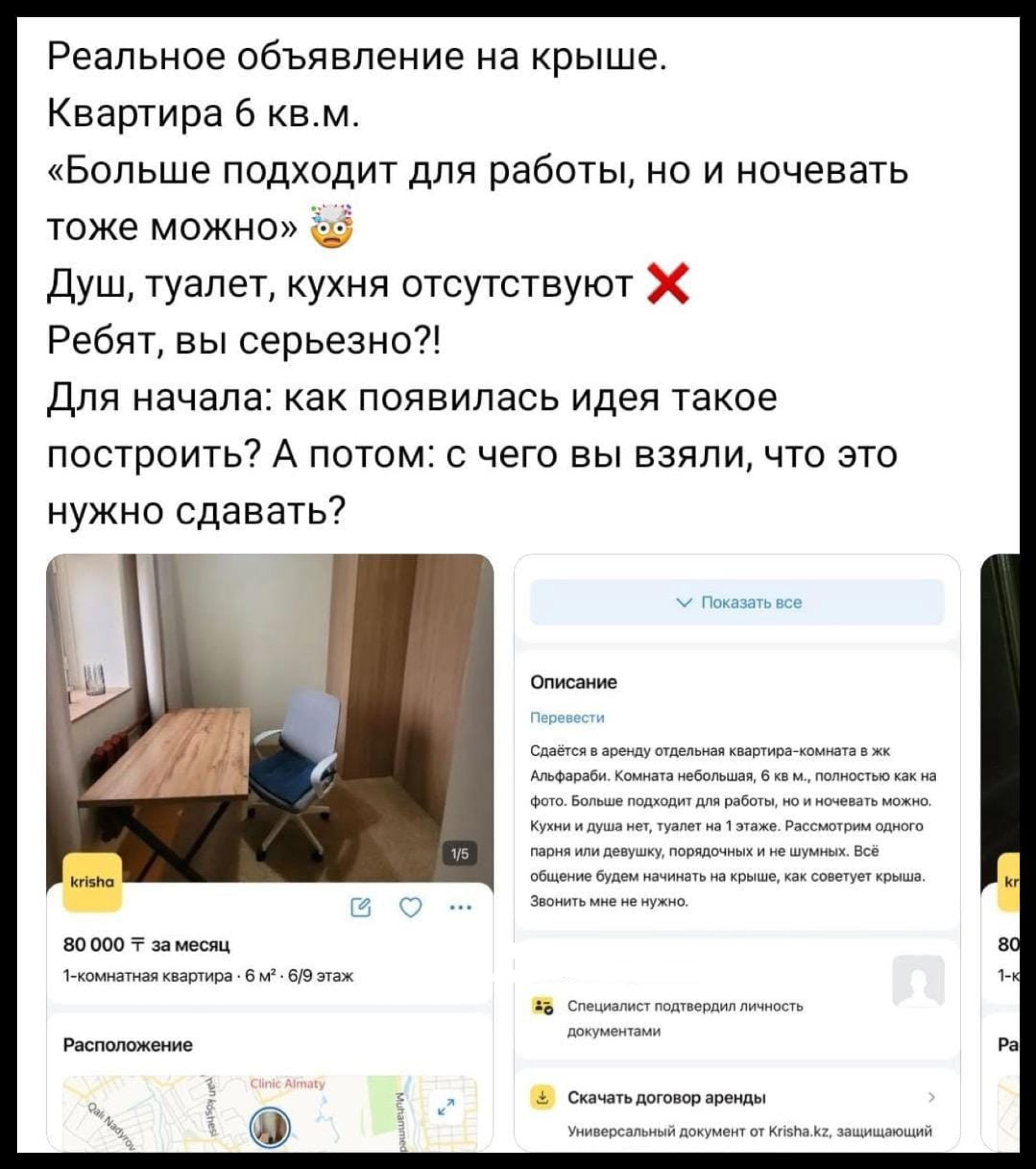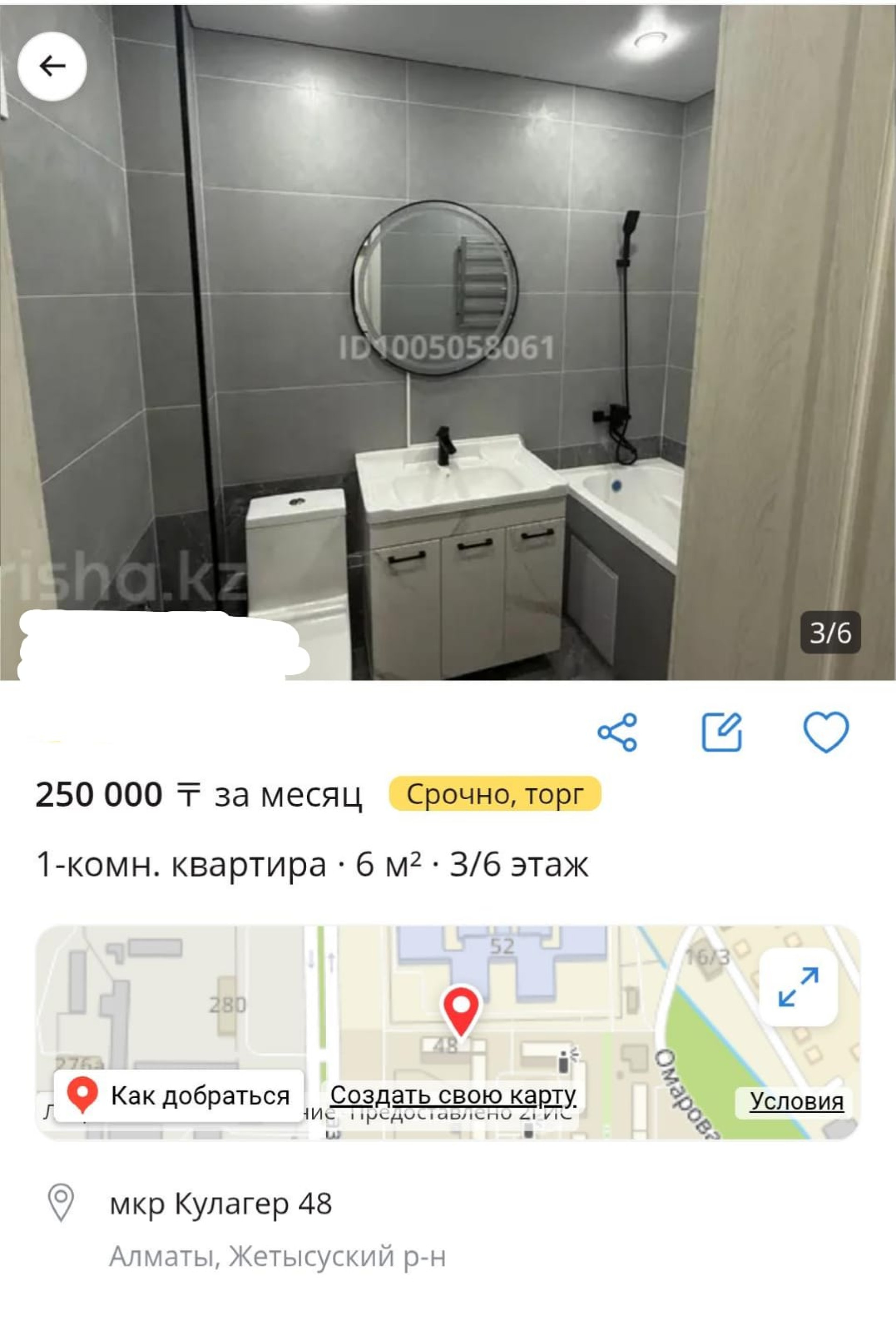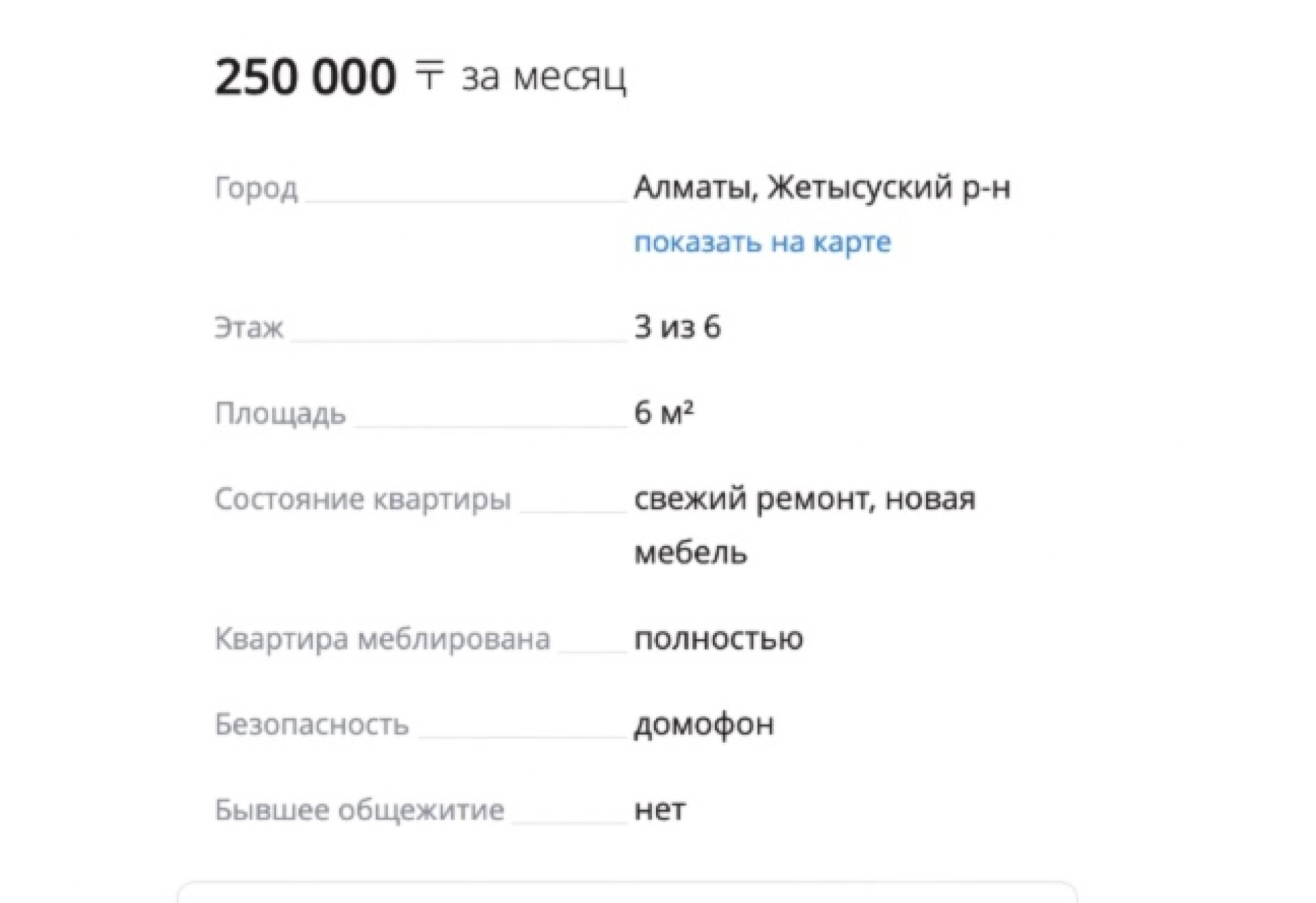 В социальных сетях обсуждают объявление о сдаче жилья в Алматы. Арендодатель предлагает так называемую квартиру-комнату площадью всего 6 квадратных метров, подробнее рассказывает Tengri Life.
