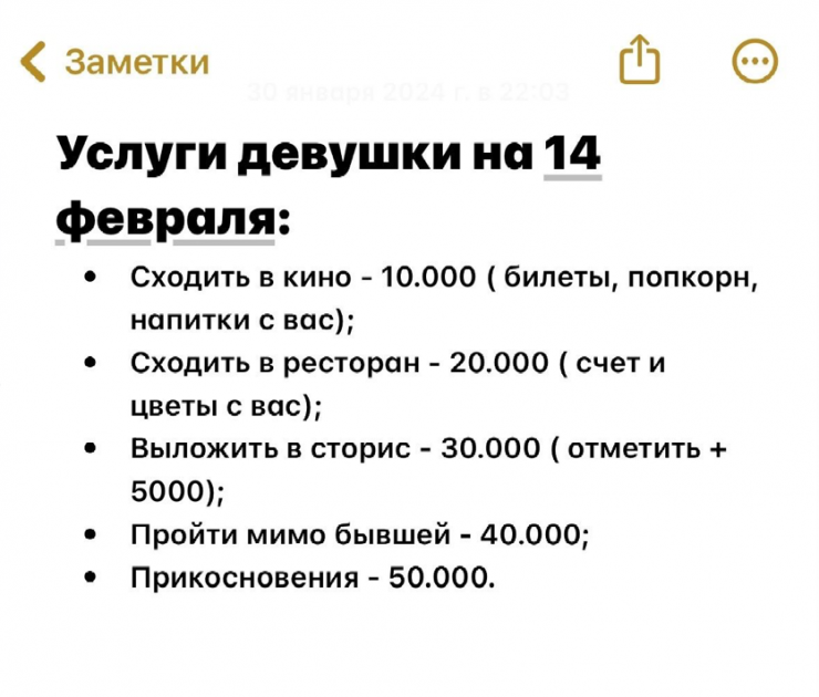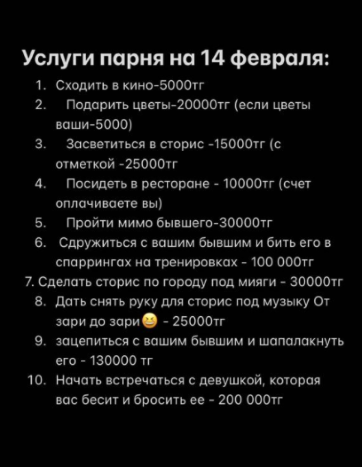 Свои услуги предлагают и девушки, которые тоже готовы "притвориться возлюбленной на 14 февраля". За поход в кино девушки берут 10 000 тенге. Услуга "пройти мимо бывшей избранницы" будет стоить казахстанцам 40 000 тенге.