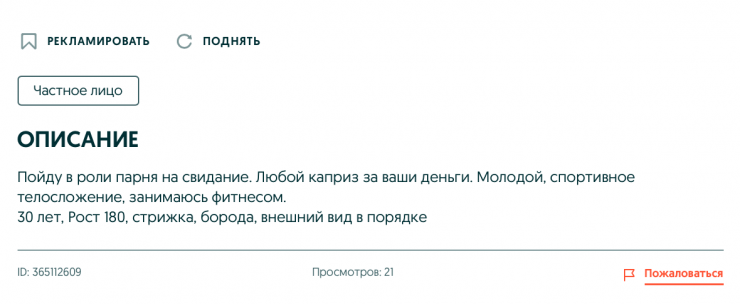 Отметим, что, конечно, не все услуги реальны, большинство из объявлений – шуточные. Тем не менее существуют мужчины и женщины, которые действительно этим зарабатывают. Как правило, свою деятельность они ведут открыто. В таких объявлениях присутствует более точная информация о характеристиках, хобби и увлечениях.