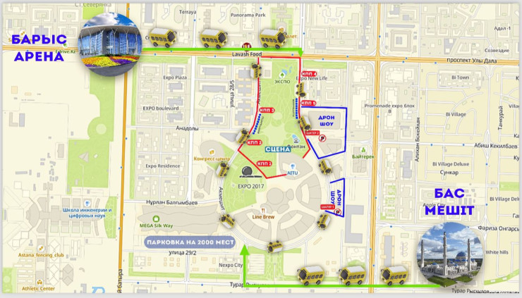 Адреса мест, где можно оставить автомобиль и пересесть на автобусы: парковка Бас мешіт (улица Мангилик Ел, 65) и парковка "Барыс Арена" (проспект Туран, 57).
