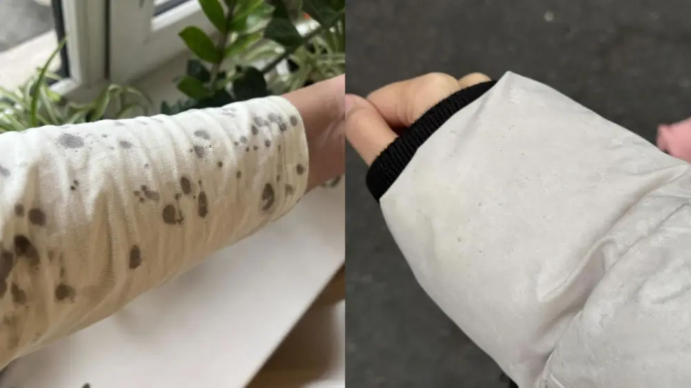 Один из горожан опубликовал фото рукава своей кофты, покрытого чёрными пятнами. По его словам, они появились после того, как он попал под дождь.