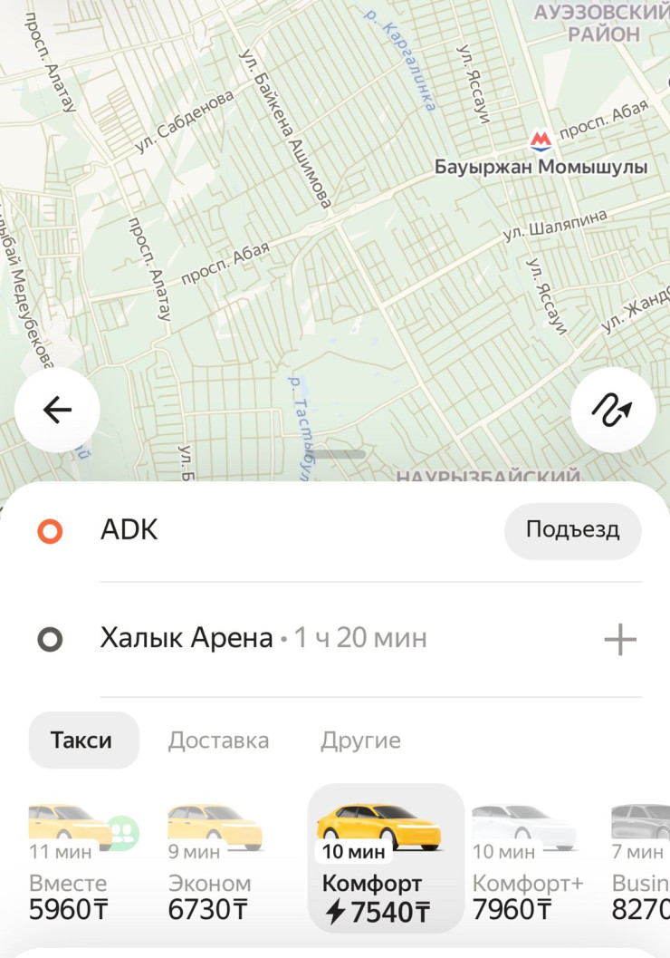 В принципе, сейчас в городе сильные пробки, которые влияют и на стоимость поездок на такси. Во многих службах такси действует динамическое ценообразование, и тарифы могут увеличиваться в зависимости от текущей загруженности дорог. Поездка от Центрального стадиона до Esentai Mall обойдется в кругленькую сумму. Самый дешевый тариф в сервисе "Попутчик" будет стоить 3600 тенге.