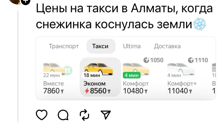 Как известно, в Алматы стоимость такси варьируется в зависимости от выбранного сервиса и тарифа. Однако погодные условия, конечно, вносят свои коррективы. Как любят шутить жители города, капля дождя или снега существенно меняет тарифы.