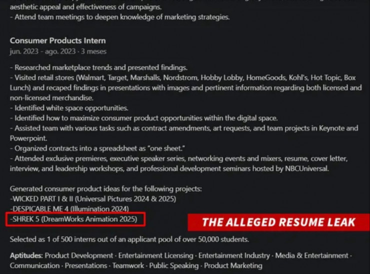 По данным СМИ, бывшая стажерка написала в своем резюме на LinkedIn, что недавно работала в NBC Universal, материнской компании студии DreamWorks. В своем документе она указала, что мультфильм "Шрек 5" выйдет в 2025 году. Скриншот резюме разлетелся в сети. Как отмечает издание, девушка якобы работала над тем, "как тонко и незаметно интегрировать продукты и бренды в мультфильм".