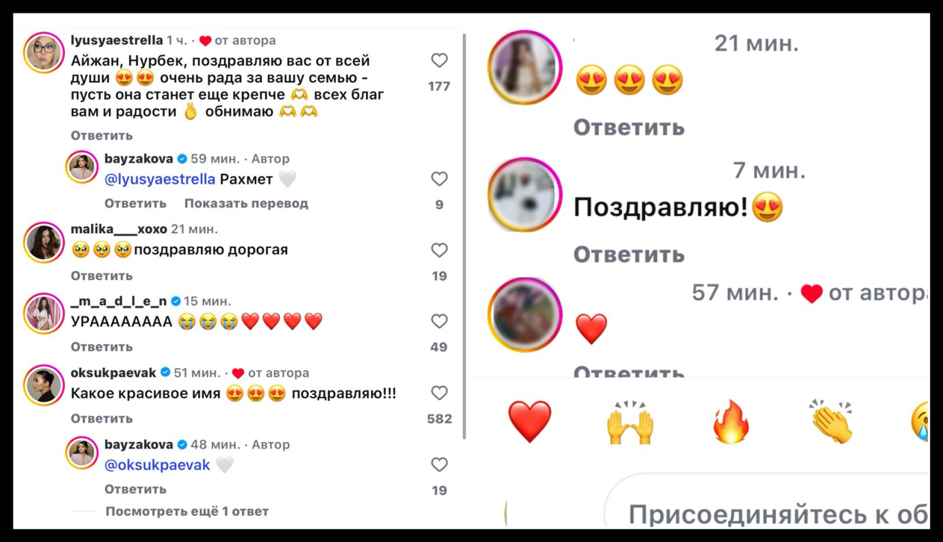 Подробностями Айжан пообещала поделиться позже. Пока же она принимает поздравления от подписчиков и друзей.