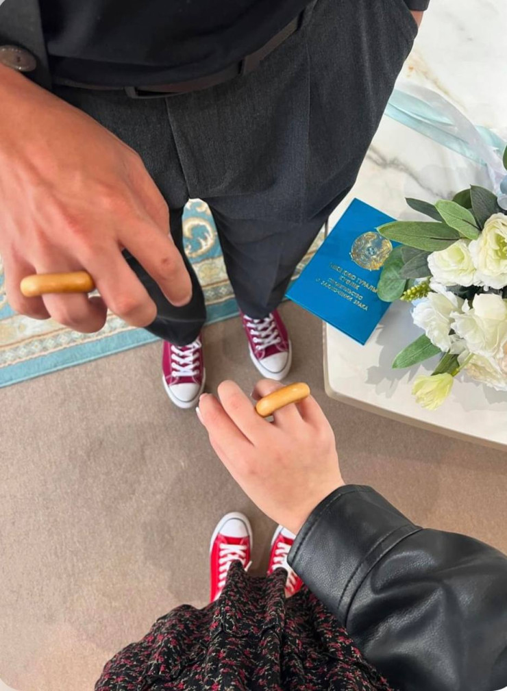 "Так получилось, что приданое, мои вещи упаковали и отправили в столицу на машине. Случайно вместе с грузом уехали и наши обручальные кольца. Мы же вылетели поздно вечером из Шымкента в Астану. Дата регистрации была уже на следующий день, то есть 10 сентября, и время было 10:10. А кольца были еще в дороге и не успевали прибыть вовремя. Но мы не стали сильно переживать. Начали думать, как выкрутиться из ситуации. В итоге выбрали сушки. Честно говоря, мы с мужем относимся позитивно к таким моментам. Мы считаем, что это романтично. Регистратор в загсе сначала не поняла всей ситуации, но потом она вникла в обстоятельства. Многие в рагсе посмеялись", – отметила Айжан.