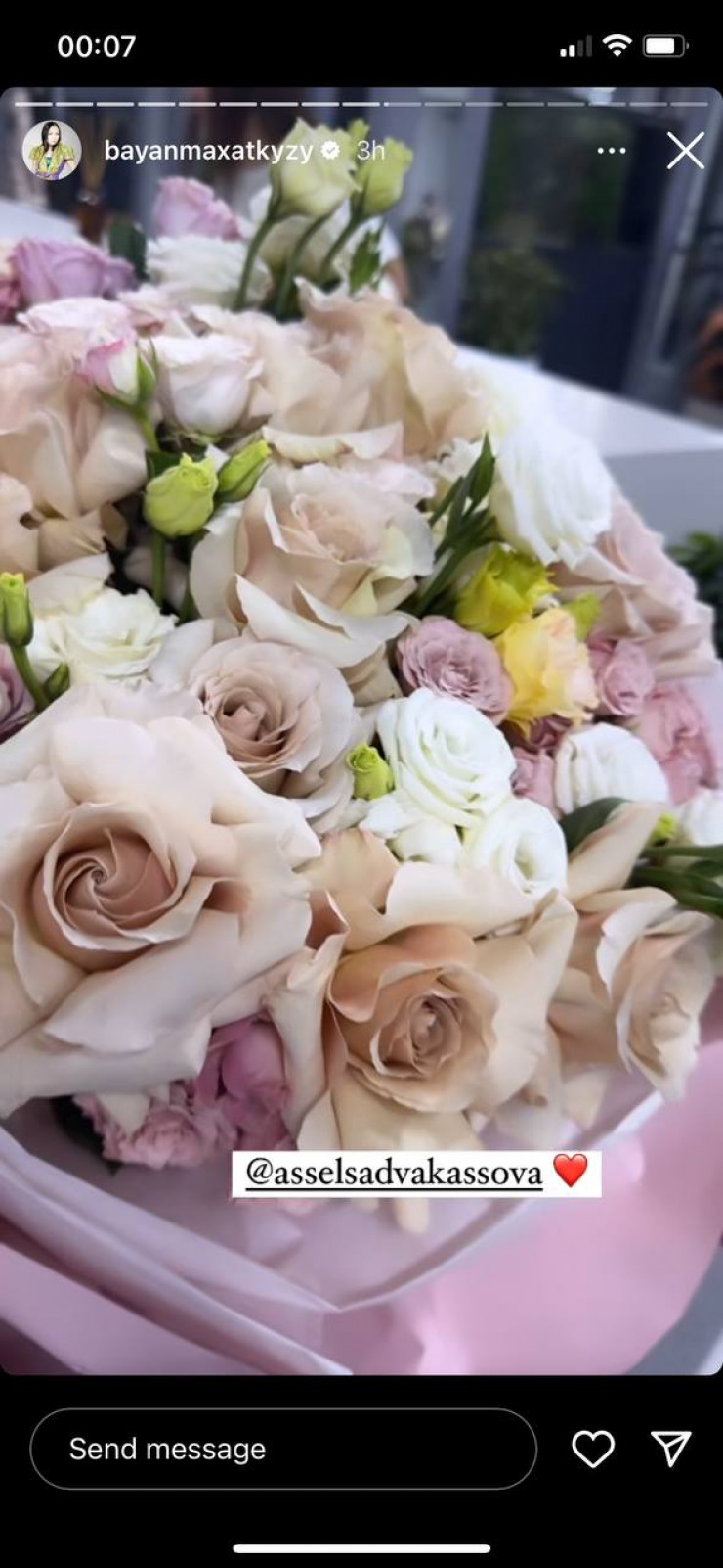 Баян Есентаева провела вечер 14 февраля в подготовке к предстоящему шоу. Она рассказала, что в этот праздник получила красивый букет от Асель Садвакасовой, и поблагодарила ее за внимание.