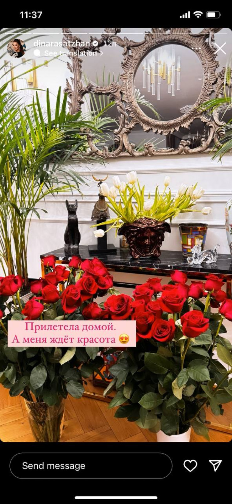 Динара Сатжан поделилась сюрпризом, который ждал ее по возвращении домой. Она опубликовала фото роз, которые обнаружила в квартире по приезде.