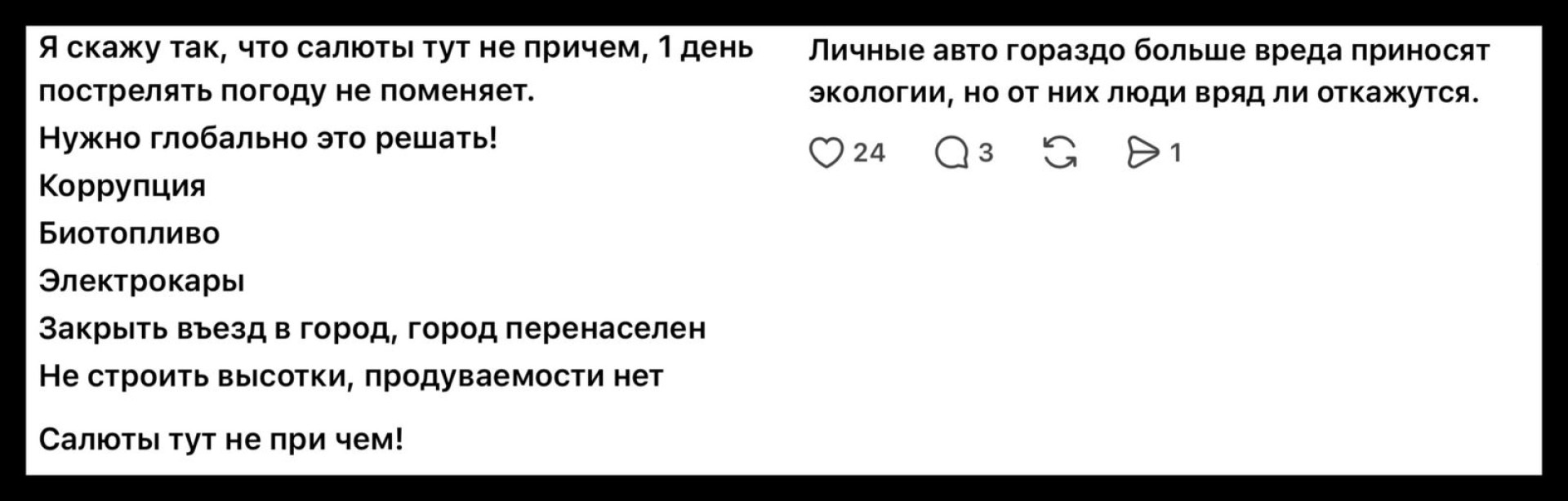 "Даже если у меня хватает денег купить салюты, я никогда этого не сделаю. Самая бесполезная трата денег", "Даже мои глаза отказываются воспринимать эту катастрофу — как мы ещё живы?!", "В прошлом году весь город был в салюте. Ради двух минут тщеславия — сплошной эгоизм", "Салюты вредят воздуху, пугают животных и создают шум, при этом никакой настоящей пользы не дают только проблемы", — написали комментаторы.