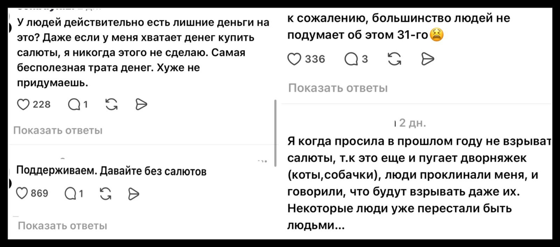 Публикация быстро собрала десятки комментариев. Многие поддержали идею провести праздничную ночь без фейерверков.