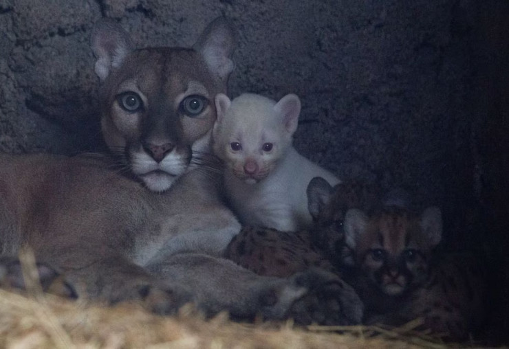 Белый детеныш здоров и хорошо кушает, рассказал ветеринар. Он добавил, что пумы-альбиносы очень чувствительны к солнечному свету и требуют внимательного ухода.