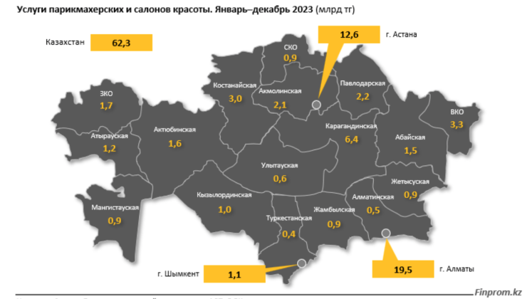 Наибольший объем услуг пришелся на Алматы: 19,5 миллиарда тенге, годовой рост – в 2,9 раза. Вторую строчку заняла Астана: 12,6 миллиарда тенге, плюс 60,5 процента за год. Замыкает тройку лидеров Карагандинская область: 6,4 миллиарда тенге – на 7,9 процента больше, чем за январь – декабрь 2022 года.