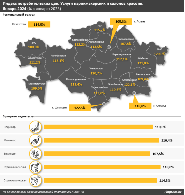 Женская стрижка в среднем по стране в январе текущего года стоила 3,5 тысячи тенге, мужская – 2,4 тысячи тенге.