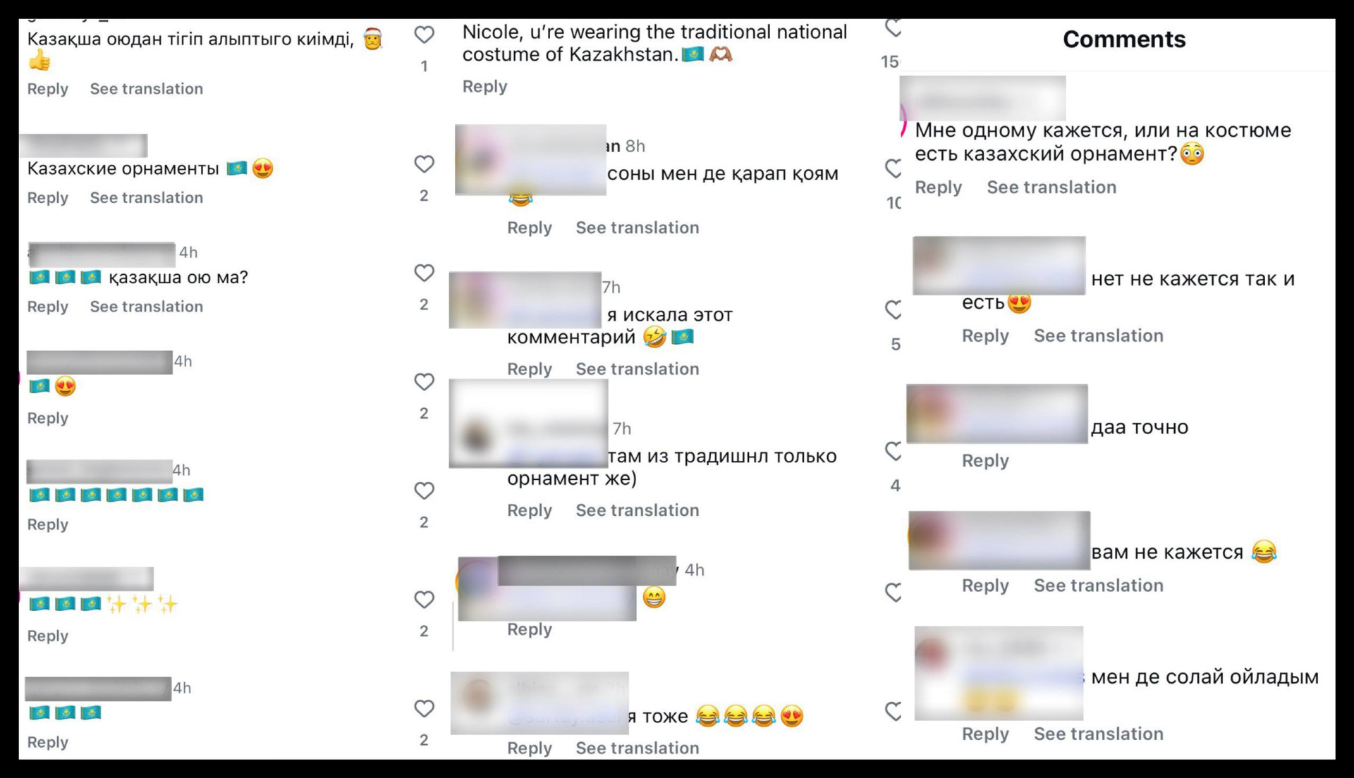 "О, казахские орнаменты", "В прошлой жизни она была казашкой", "С праздником!", "Казахская красавица Николь тате", "На одежде казахский орнамент, красота", "Счастливых каникул", "По-моему, она и внешне не отличается от казашки", "Спасибо, что надели казахский костюм", — написали комментаторы.