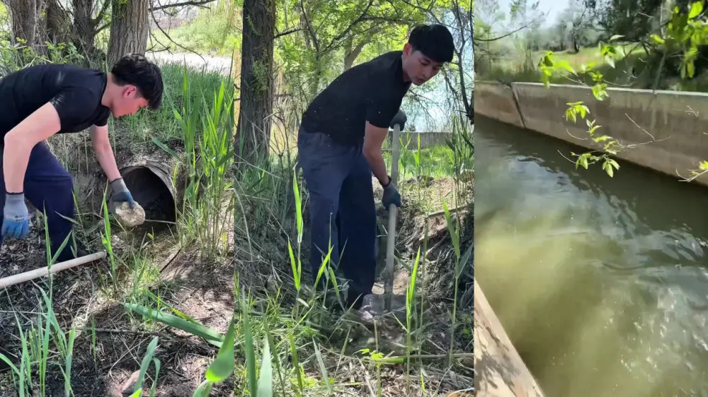 На кадрах, снятых на телефон, видно, как учитель с лопатой и в рабочей одежде убирает мусор и грязь из арыка, по которому протекает оросительная вода. За 7 часов активной работы ему удалось почистить около 500 метров.