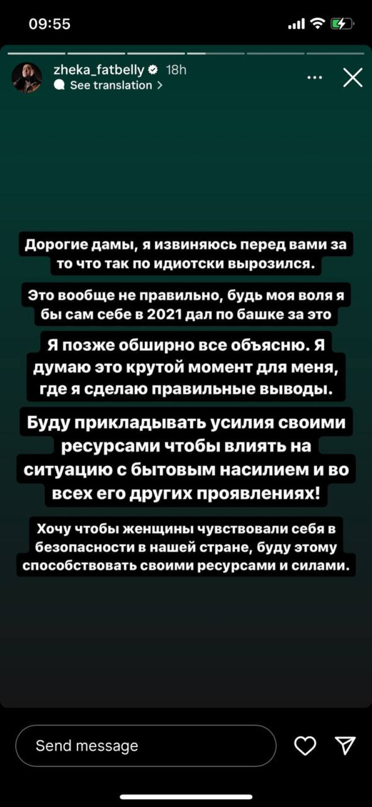"Дорогие дамы, я извиняюсь перед вами за то, что так по-идиотски выразился. Это вообще неправильно, будь моя воля, я бы сам себе в 2021-м дал по башке за это. Я позже обширно все объясню. Я думаю, это крутой момент для меня, где я сделаю правильные выводы. Буду прикладывать усилия своими ресурсами, чтобы влиять на ситуацию с бытовым насилием и во всех его других проявлениях! Хочу, чтобы женщины чувствовали себя в безопасности в нашей стране, буду этому способствовать своими ресурсами и силами", - написал он в публикации.