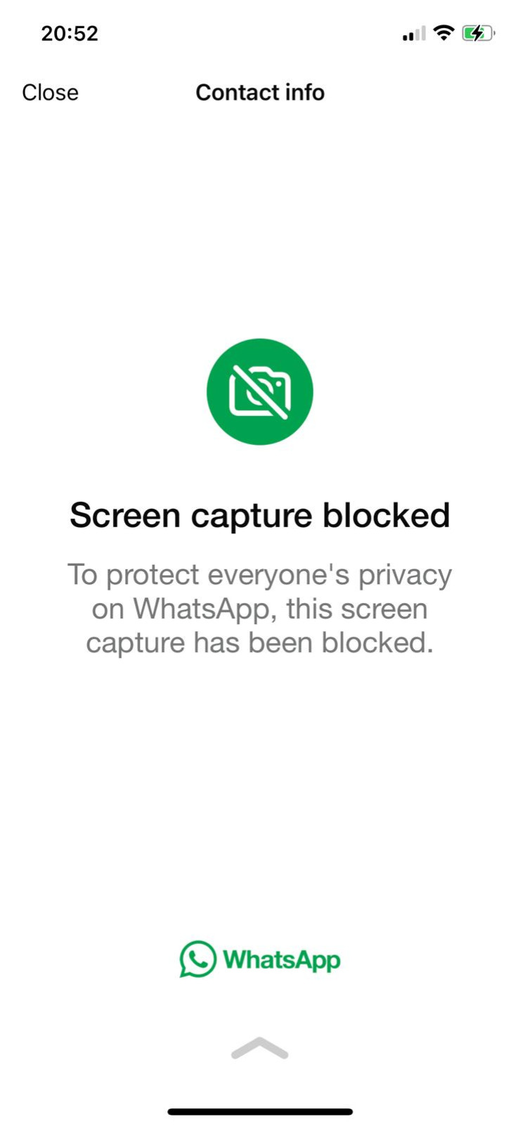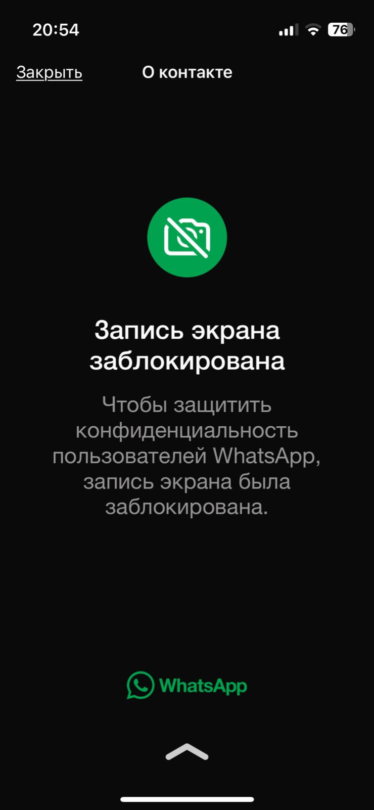 В последнем обновлении приложения пользователи заметили, что появилась новая мера защиты – запрет на создание скриншотов и запись экрана с фотографиями профиля пользователя. Теперь, если пользователь пытается сделать снимок экрана, на котором отображается фотография профиля другого человека, WhatsApp автоматически блокирует эту возможность. На экране появится уведомление о том, что выполнение действия невозможно из-за установленного ограничения.