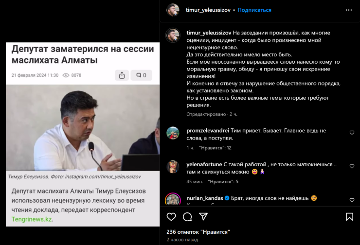 И, конечно, я отвечу за нарушение общественного порядка, как установлено законом. Но в стране есть более важные темы которые требуют решения", - заявил Тимур Елеусизов на своей странице в Instagram, прикрепив скрин с сайта Tengrinews.kz.
