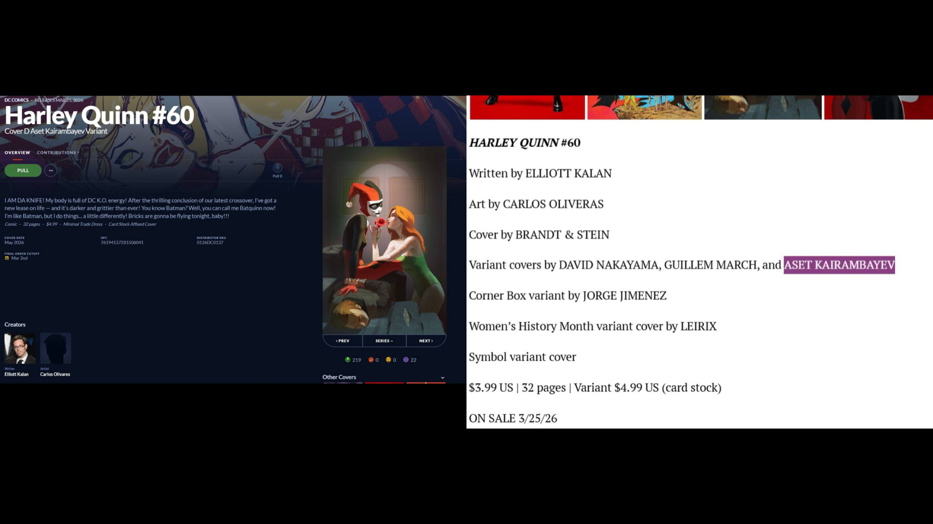 Имя казахстанца Асета Кайрамбаева, известного как Naykeed, появилось в официальном анонсе издательства DC. 30-летний иллюстратор из Астаны создал вариантную обложку для комикса о Харли Квинн, которая поступит в продажу уже в этом месяце. О том, как создавался сюжет с "ограблением и свиданием" и почему сарафанное радио работает даже в Голливуде, подробнее — на Tengri Life.