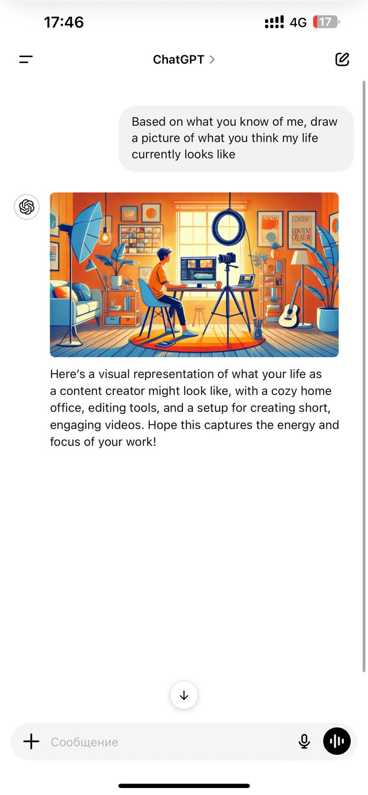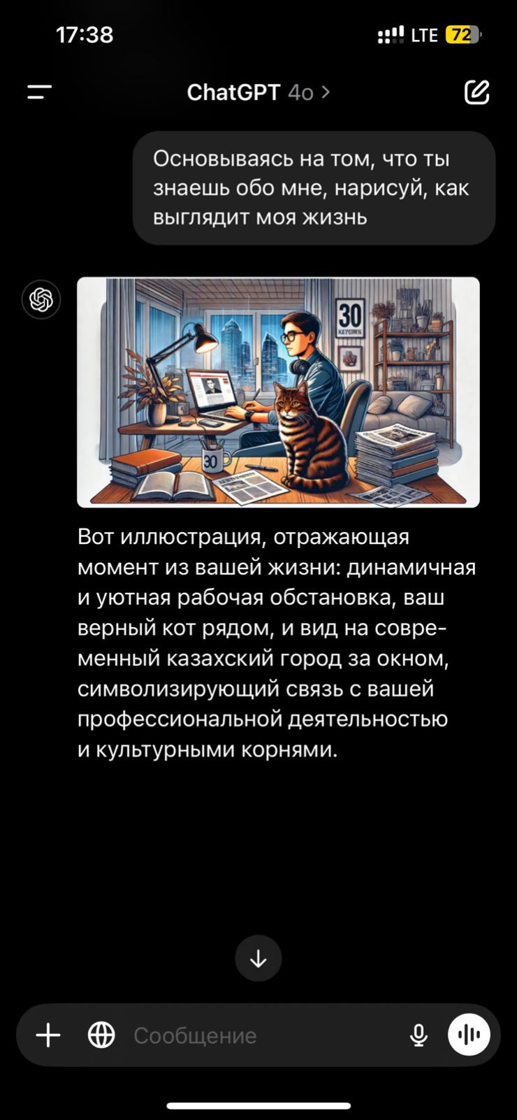 Теперь, используя возможности ChatGPT, можно получить уникальное изображение, которое отражает текущую жизнь пользователя, основываясь на том, что ИИ знает о нем. Для этого достаточно написать специальную промт-фразу: