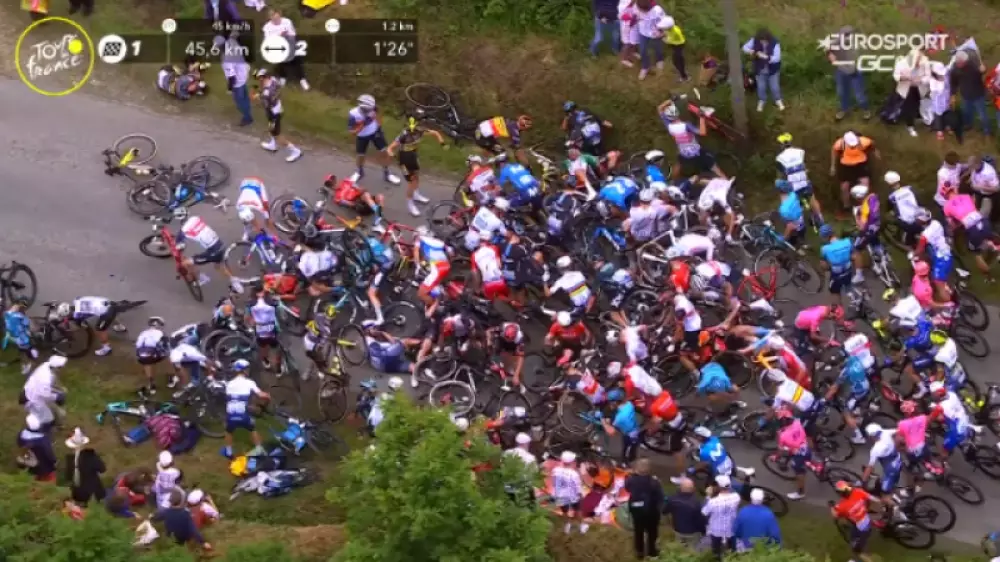 Зрительница стояла на правой стороне узкой дороги с большим картонным самодельным плакатом "Привет, дедушка и бабушка!", однако смотрела не на пелотон, а на проехавший мотоцикл с оператором. Большой плакат зацепил ехавшего с правого края в голове пелотона Тони Мартина, который упал под колеса двигавшихся плотной группой других гонщиков. За ним начали падать и другие велосипедисты. В результате в завале на первом этапе многодневки пострадал 21 гонщик.