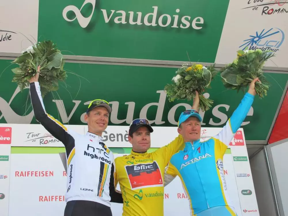 Лидер казахстанской велокоманды "Астана" Александр Винокуров занял третье место по итогам многодневки "Тур Романдии", сообщается на официальном сайте команды. Последний этап "Тура Романдии" выиграл британец Бен Свифт из команды Team Sky. За ним финишировал итальянец Давиде Вигано (Leopard), а третьим стал Оскар Фрейре (Rabobank). Первое место в общем зачете занял австралиец Кэйдел Эванс из BMC Racing. Немецкий велогонщик HTC - Highroad Тони Мартин стал вторым, уступив победителю 18 секунд. На третью ступень подиума поднялся Винокуров.