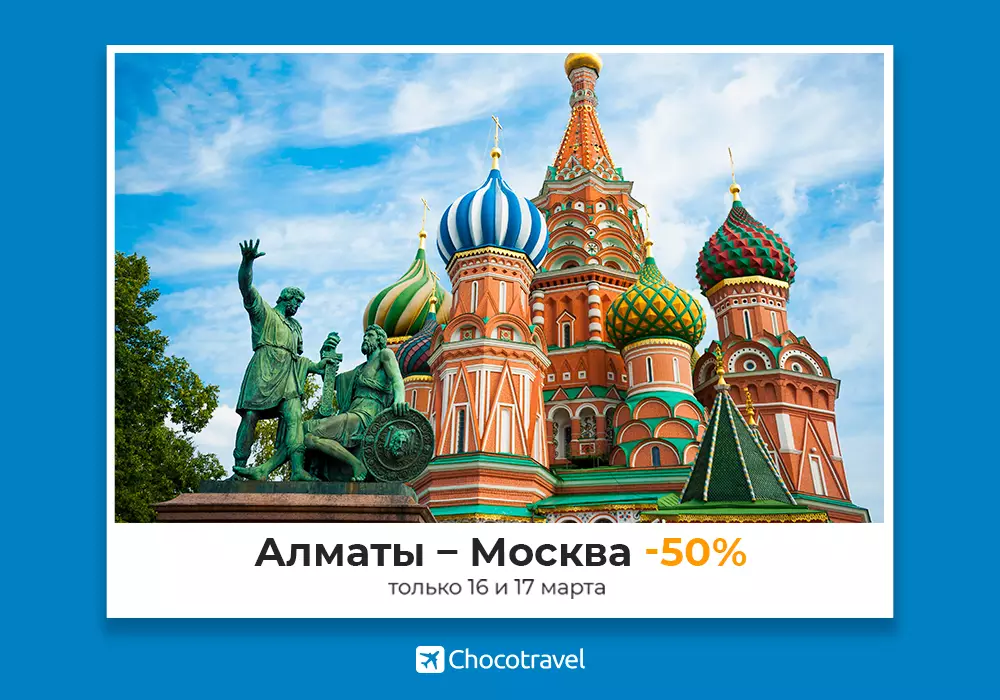 Только два дня на сайте Chocotravel действуют скидки до 50 процентов на билеты "Эйр Астаны" по направлению Алматы - Москва - Алматы.