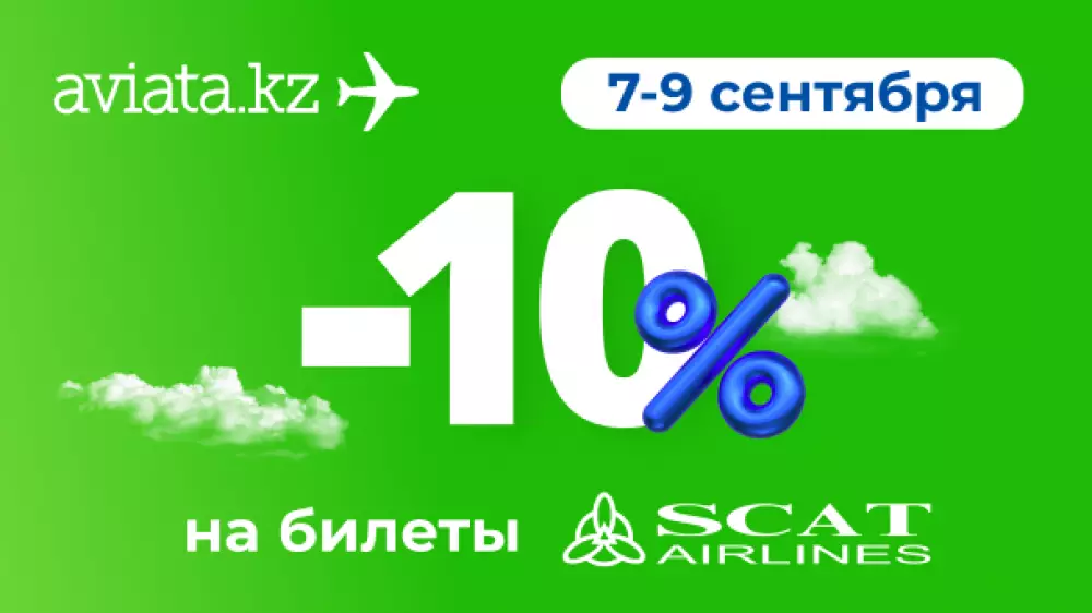 Только на Авиате можно приобрести билеты SCAT со скидкой 10 процентов. Акция действует на все направления SCAT. Авиабилеты со скидкой можно приобрести в период с 7 по 9 сентября, кроме субсидированных направлений* и детских тарифов. А даты путешествий не ограничены.