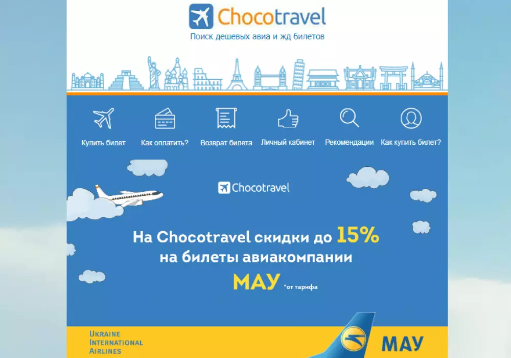 Вот, например, авиакомпания МАУ объявила скидку до 15 процентов от стоимости тарифа по всей маршрутной сети! Экономия 15 процентов! Не упустите свой шанс.
