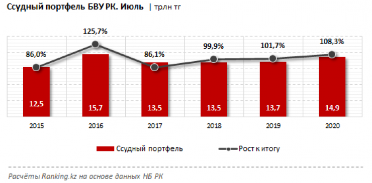Замыкает тройку лидеров по годовому росту ссудного портфеля Народный Банк: плюс 13 процентов, до 4,5 триллиона тенге. В денежном выражении рост составил 512,4 миллиарда тенге.