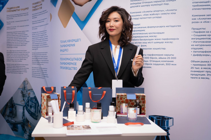Ученая Satpayev University Алматы Гульжан Тузельбаева представила на выставке свой парфюм. Самым необычным в ее коллекции является парфюм с ароматом большого красного яблока - алматинского апорта. В целом у молодой ученой целая линейка парфюма. Многие ароматы названы настоящими женскими и мужскими именами. Гульжан говорит, что за научными открытиями будущее.