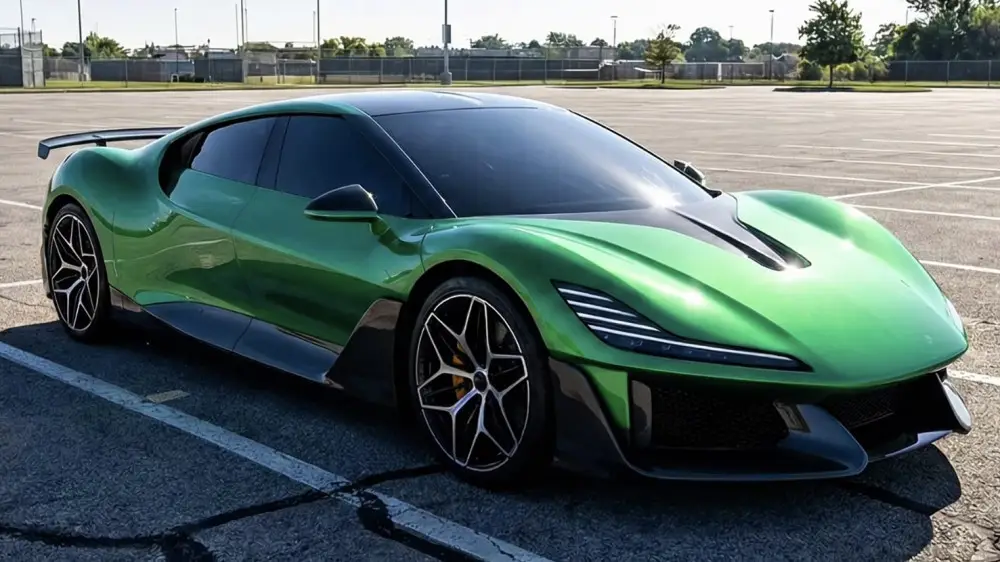 Кузов окрашен в яркий зелёный цвет и обильно декорирован деталями из углеродного волокна, включая стойки и различные панели. Передняя часть с низким капотом и характерными L-образными фарами напоминает современные итальянские суперкары.
